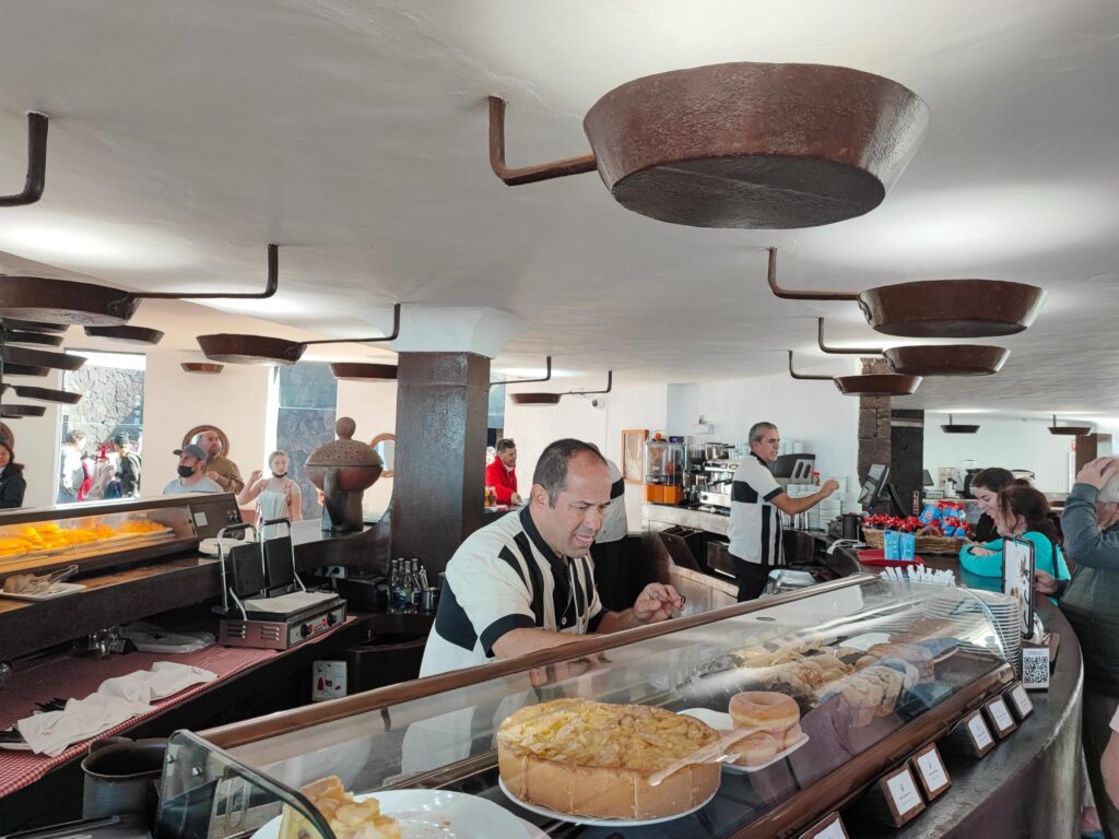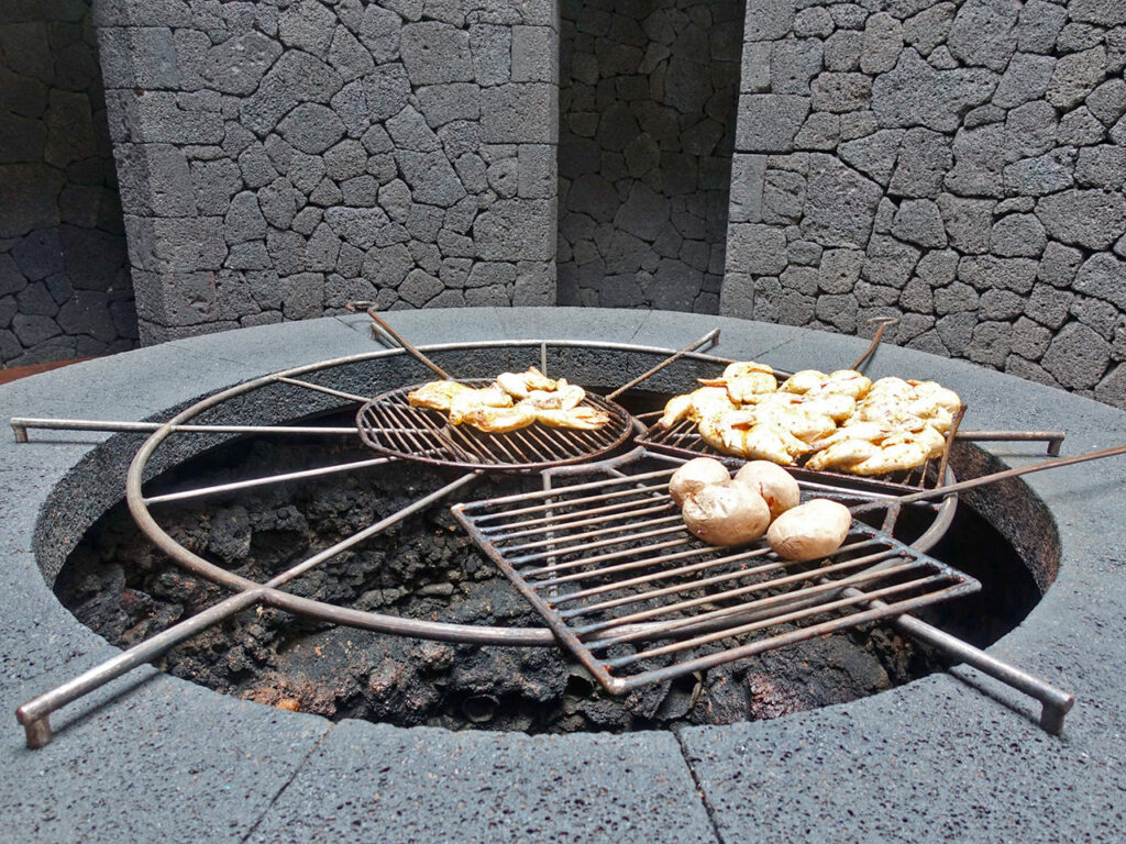В заключение экскурсии стоит заглянуть в ресторан Эль Диабло, построенный по проекту Сесара Манрике, где мясо готовят на вулканическом жаре. Издалека ресторан напоминает приземлившуюся на Луне летающую тарелку. Еда в ресторане Эль Диабло не лучшая на острове, но можно же просто выпить кофе или бокальчик местной мальвазии. Зато какие виды из окон! Впечатления от парка вулканов надо аккуратно уложить в голове, и в ресторане это получается особенно эффективно.